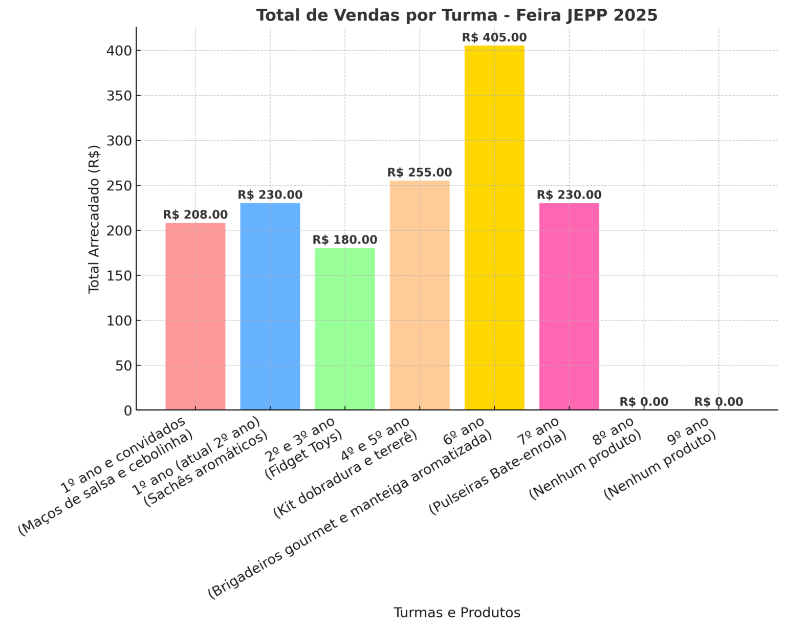 9º ano Total de alunos e participantes 4 alunos Produto de venda Não teve produto de venda Premiação coletiva *o grupo decidiu pela compra de produtos a serem vendidos no Colégio com o objetivo de gerar fundos para a formatura 2025.