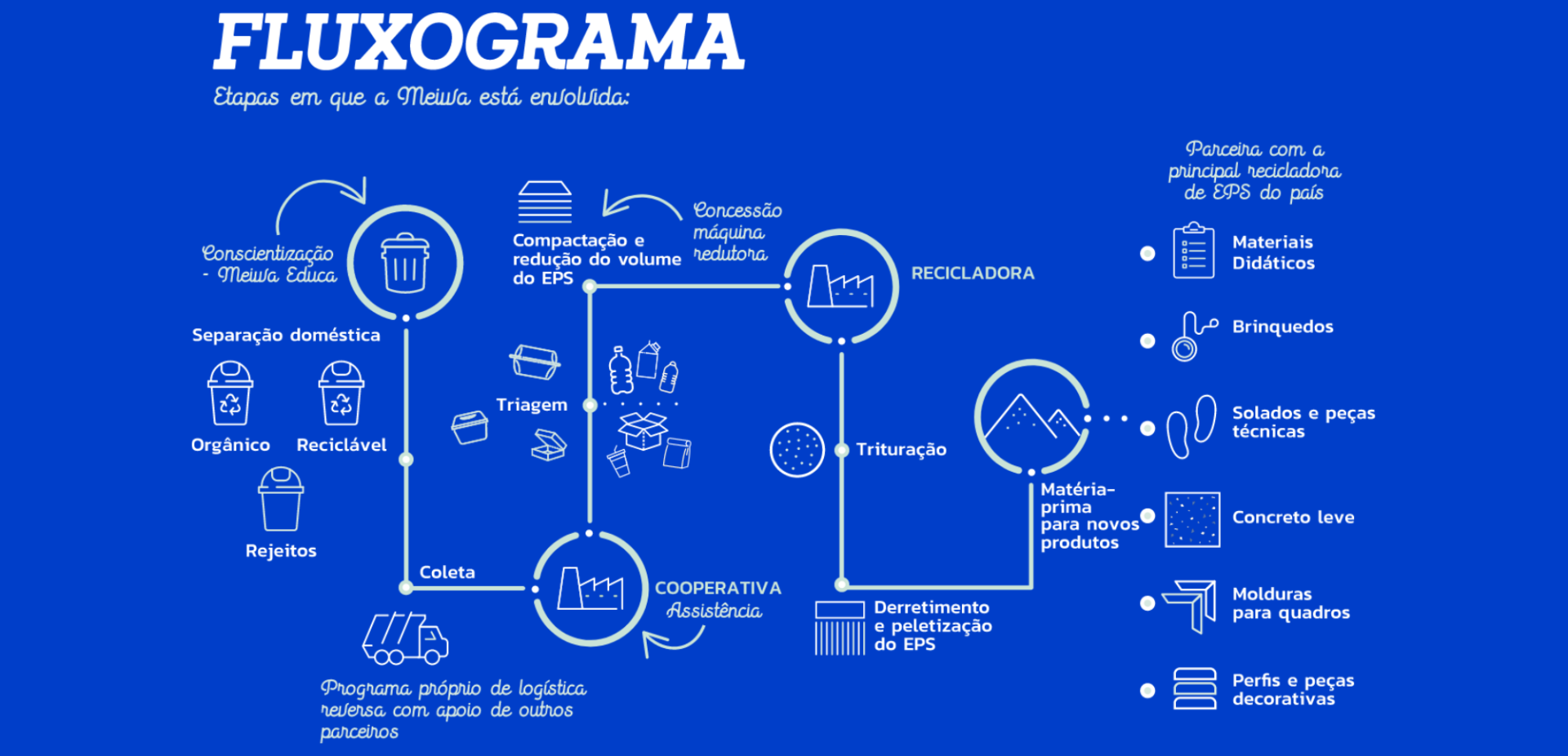 Esse material, que antes era descartado de forma errada, agora segue um processo de reciclagem completo, em parceria com a Meiwa, gerando novos produtos como: Materiais didáticos, brinquedos, solados e peças técnicas, concreto leve, molduras e perfis decorativos.